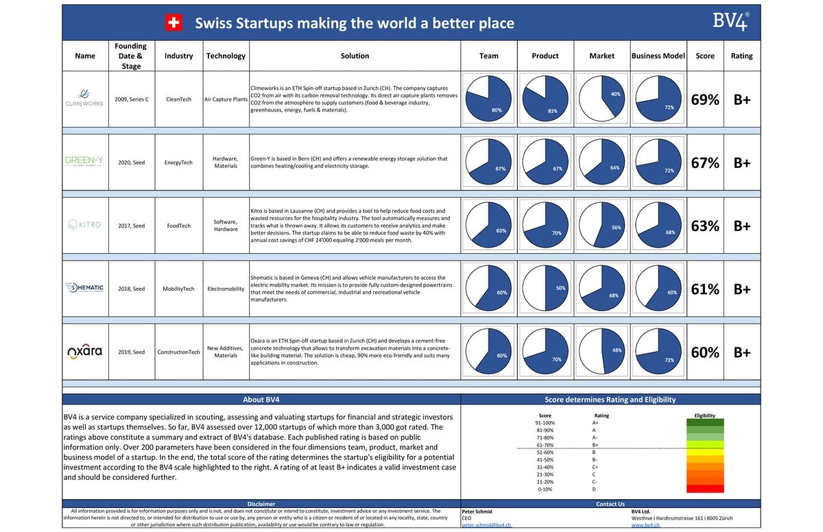 In occasion of the World Economic Forum 2020 (WEF 2020), BV4 scouted some Swiss Startups which solutions aim to make the world a better place. We introduce here the following startups: Climeworks that is an CleanTech ETH Spin-of, Green-Y who is active in the Energy sector and more particularly in the storage of renewable energies. Then there are Kitro who offers a smart solution against food waste and Shematic who develops custom-designed powertrains in the green MobilityTech field. Finall, least but not last, Oxara who is a ConstructionTech ETH Spin-off that develops a cement-free concrete technology.